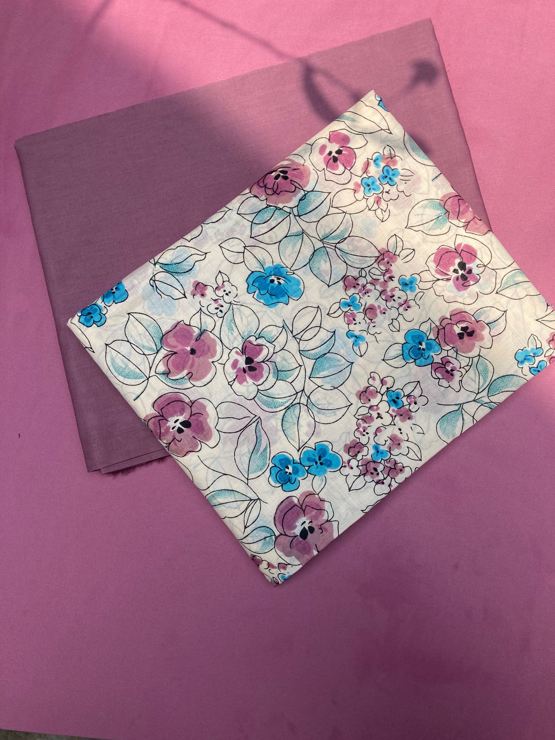 Design: Playful floral print with shades of purple, blue, and pink, accented with leafy outlines for a refreshing look.