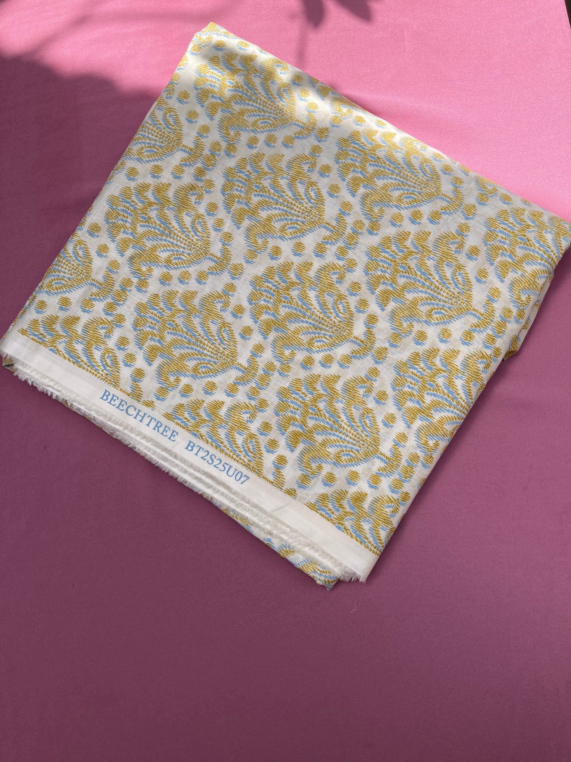 🌸 Design: Traditional-inspired motifs in mustard yellow, highlighted with soft blue accents, giving a fresh and classy summer vibe.